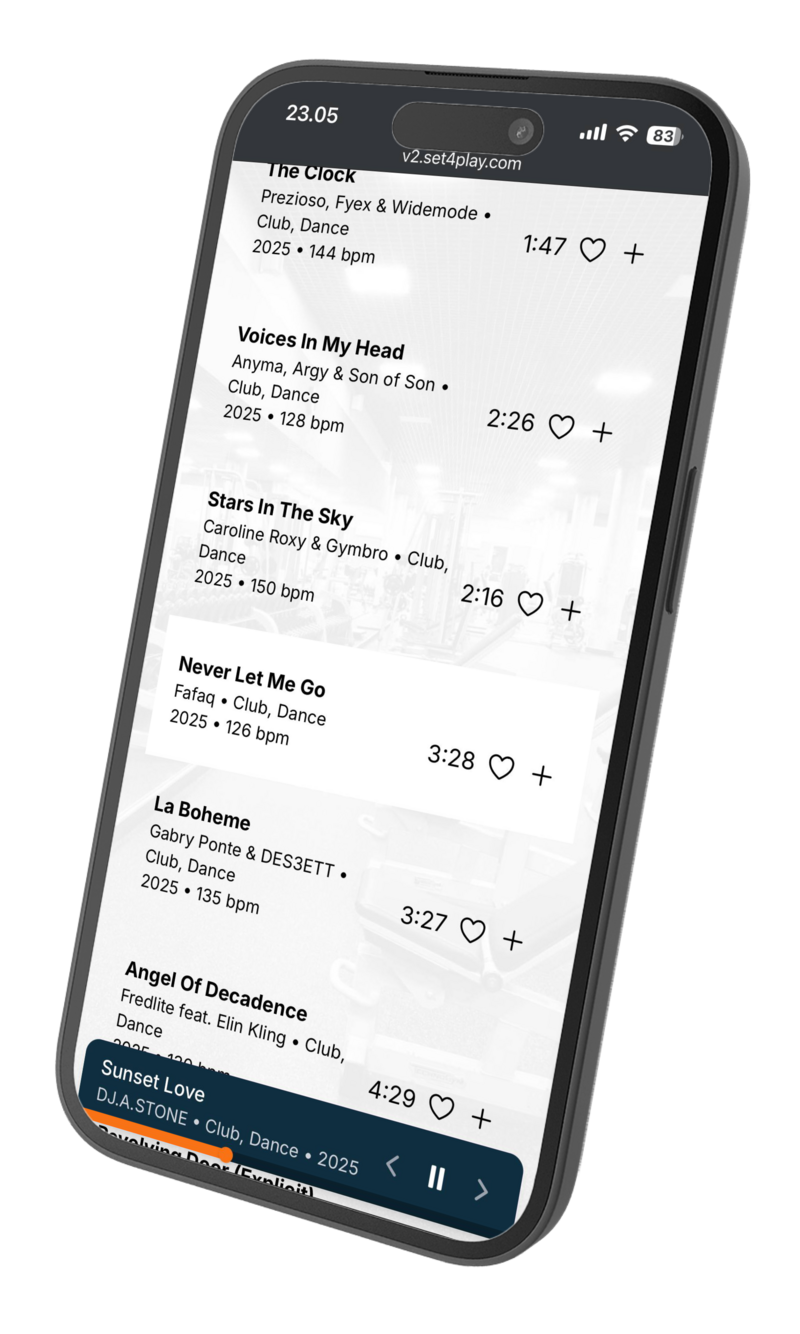 Every track is licensed for commercial use — PPL and PRS free, no takedown notices. Plus a growing collection of royalty-free music for fitness classes. Just press play.